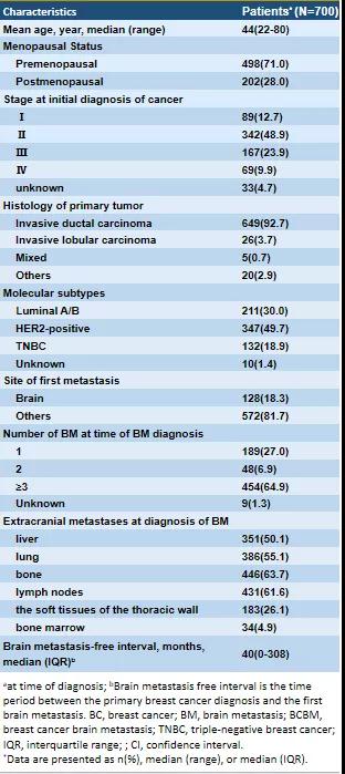 基于脑转移患者当前存在预后差、治疗手段少等特点,我们团队回顾性收集了2003年1月1日至2021年6月30日就诊于解放军总医院肿瘤医学部乳腺肿瘤病区的700例乳腺癌脑转移患者的临床数据,并进行了临床特征及预后分析,希望通过真实世界数据为脑转移患者提供更多循证医学证据,使脑转移患者今后能接受更好的治疗,进一步延长其生存。