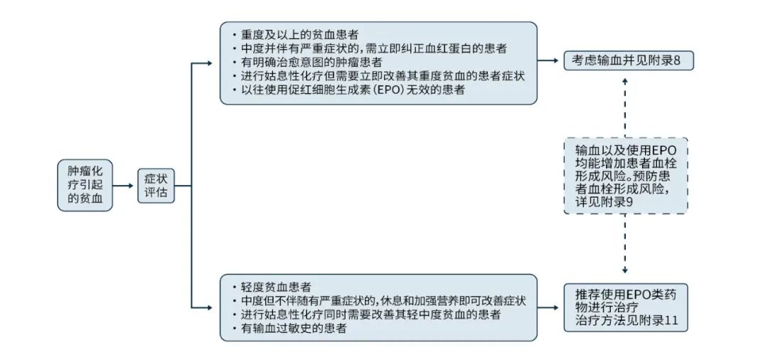 若初步判定贫血为CRA但并非化疗相关,则应考虑肿瘤本身所导致的出血、骨髓侵犯、营养不良或铁代谢异常等原因。若判定CRA为化疗相关,则应进行血液学评估,包括贫血严重程度、伴随症状及合并症,从而决定是否需要输血和接受其他相关治疗。