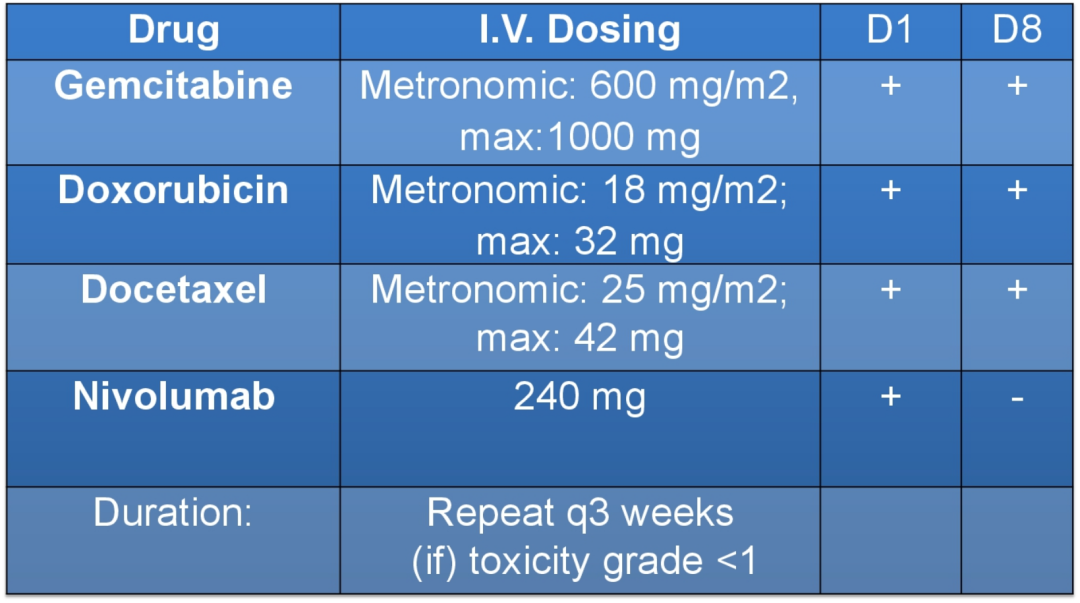 治疗方案:节拍式给药:吉西他滨(600mg /m2,最大剂量:1000mg),阿霉素(18mg /m2;最大剂量:32mg)、多西他赛(25mg /m2;最大剂量:42 mg)均第1、8天给药,纳武利尤单抗(240 mg)仅在第1天使用。如果不良反应<1级,可每3周给予重复治疗周期。