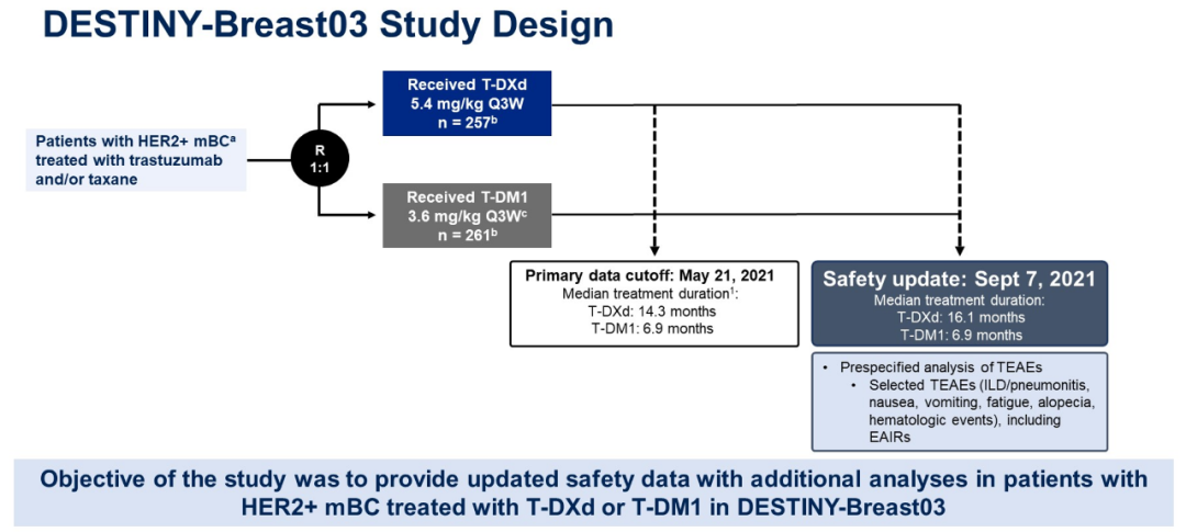 背景:DESTINY-Breast03研究(NCT03529110)已证实,抗体偶联药物(ADC)T-DXd用于经过抗HER2治疗的HER2阳性转移性乳腺癌(HER2+mBC)可相较于T-DM1显著改善患者PFS(BICR评估:HR 0.284;95%CI:0.217~0.373;P<0.001),由此树立新的抗HER2二线治疗标准。在该研究的首次期中分析(数据截至2021年5月21日)中,T-DXd的安全性与既往研究一致,整体安全可控、耐受性良好。此次分析将提供更长随访(数据截至2021年9月7日)的安全性数据。
