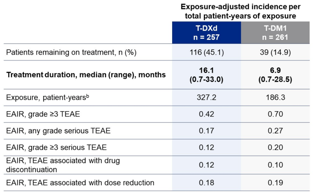 T-DXd组和T-DM1组患者的停药相关TEAE的EAIR(0.12 vs 0.10)相当;除此以外,T-DXd组患者的≥3级TEAE的EAIR(0.42 vs 0.70)、任何级别严重TEAE的EAIR(0.17 vs 0.27)、≥3级严重TEAEs的EAIR(0.12 vs 0.20)均低于T-DM1组,减药相关TEAE的EAIR(0.18 vs 0.19)也低于T-DM1。