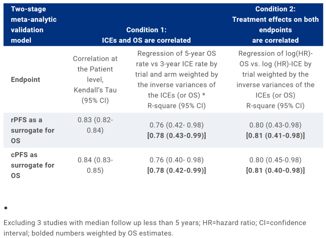 结论:rPFS和cPFS似乎都是OS的有效替代终点。0.82或更高的替代阈值效应使得rPFS或cPFS可以作为主要终点,作为mHSPC患者3期临床试验中OS的替代终点,并将加快试验的进行。计划在具有其他作用机制的药物试验中验证这些ICE。
