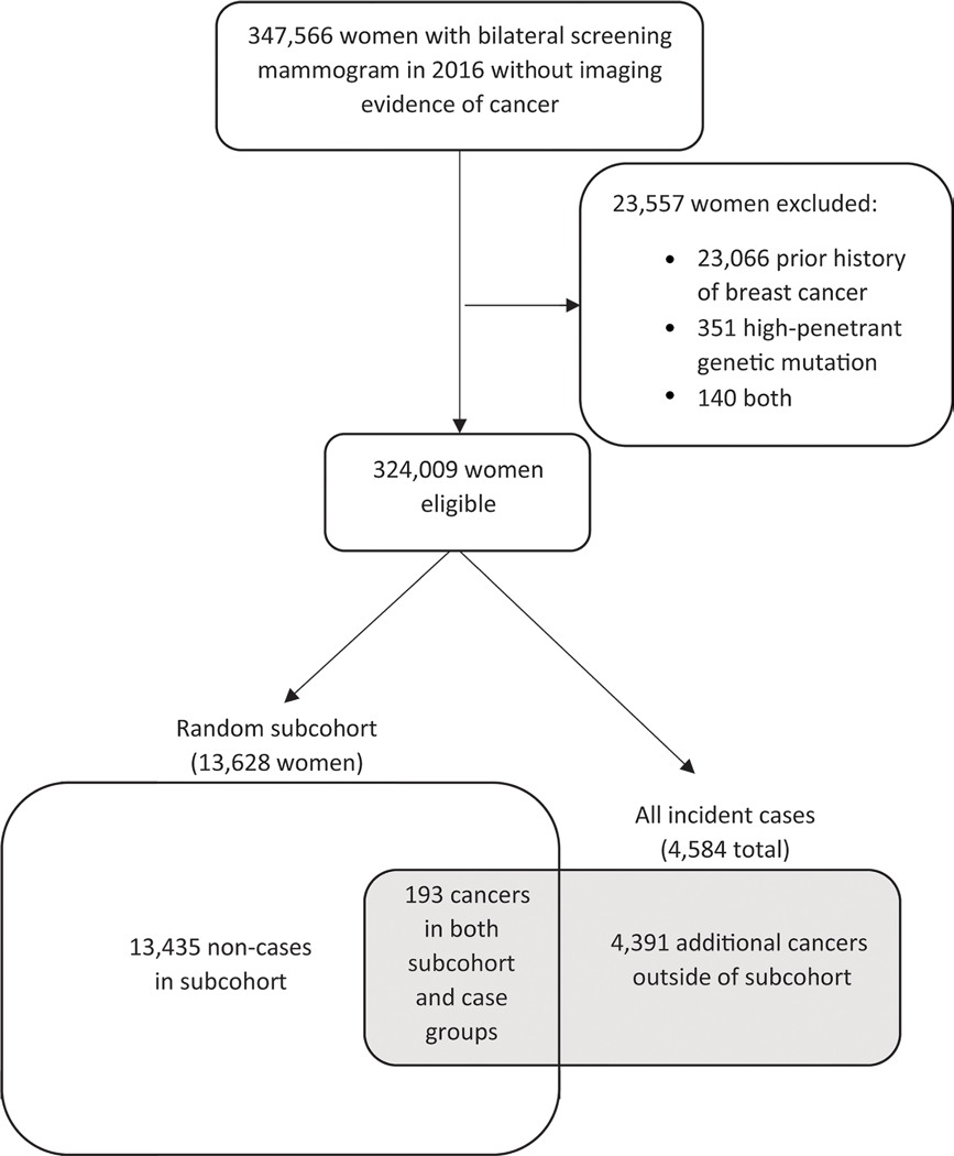 被随访的女性在北加州凯泽永久医疗集团(Kaiser Permanente Northern California)接受随访至2021年。既往患有乳腺癌或基因突变的女性被排除在外。在324009名符合条件的女性中,随机选择了13628名妇女(4.2%)的简单随机队列进行分析,其中包括193名患有乳腺癌的妇女。还纳入了2016年乳房X线检查后5年内被诊断为癌症的整个队列中的另外4391名患者。使用受试者工作特征曲线(AUC)下的时间依赖性区域计算初始乳房X线摄影检查后0至5年发生乳腺癌的风险估计。