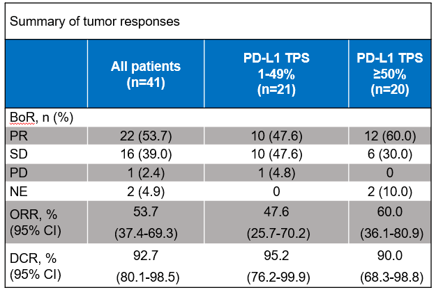 该研究是由上海市肺科医院周彩存教授牵头,评估卡瑞利珠单抗联合法米替尼一线治疗PD-L1表达阳性的晚期非小细胞肺癌(NSCLC)的多中心、开放标签Ⅱ期篮子研究,研究纳入41例既往未经系统治疗的晚期NSCLC患者(PD-L1 TPS≥1%),EGFR和ALK阴性,主要研究终点为RECIST v1.1评估的客观缓解率(ORR)。