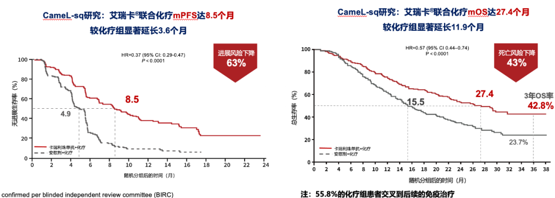 卡瑞利珠单抗联合化疗治疗晚期非鳞和鳞状NSCLC的两项大型III期注册临床研究CameL、CameL-sq研究也取得了PFS和OS的双阳性结果。中位OS均超越27个月,是目前OS最长且唯一双OS阳性的国产PD-1抑制剂。
