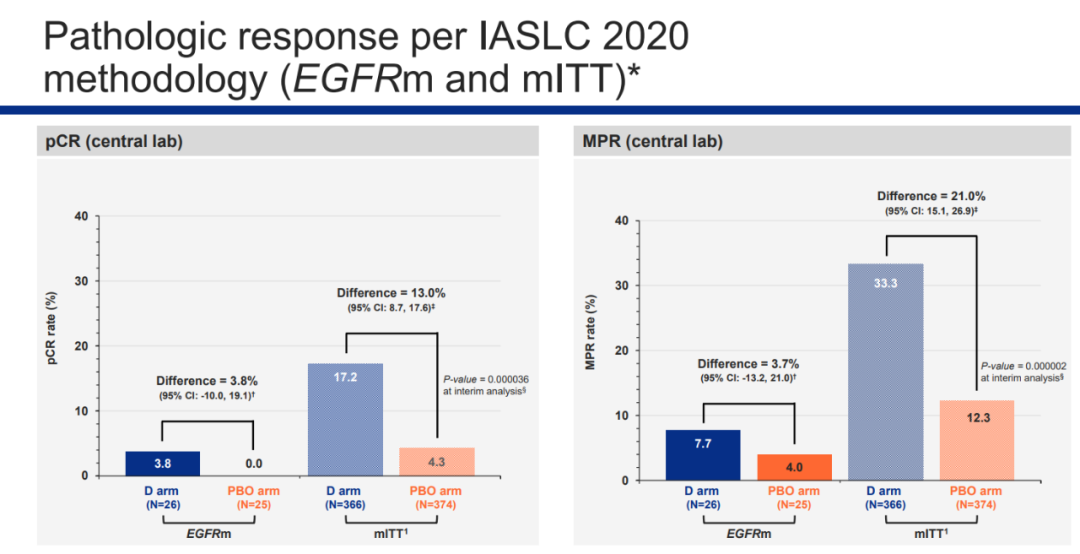EGFR突变患者在参与试验的800多名受试者中只占一小部分,仅51名(度伐利尤单抗组,n=26;安慰剂组,n=25),其中许多患者来自中国。这项亚组分析显示,添加免疫治疗后没有呈现获益信号(在EGFR突变人群中,度伐利尤单抗组和安慰剂组的pCR分别为3.8%[n=1]和0%,主要病理缓解率[MPR]分别为7.7%和4.0%,未观察到新的安全信号,两组的不良反应发生率相似。但由于患者数量较少,结果解读应谨慎。而在ITT人群中,度伐利尤单抗组和安慰剂组的pCR分别为17.2%和4.3%,MPR分别为33.3%和12.3%)。