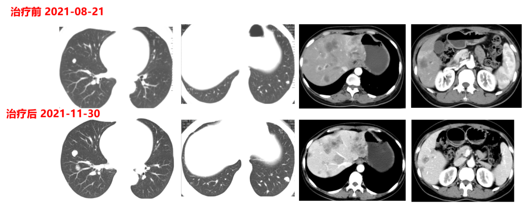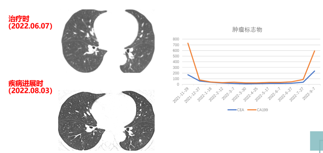 患者于2021年11月30号复查时,肺上病灶增大增多,肝脏病灶稍增大,肿瘤标志物增高,整体疗效评价PD,考虑一线治疗进展。