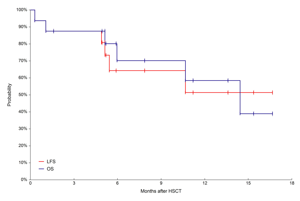 图1.16例T-ALL/LBL患者二次移植后的总生存率和无白血病生存率