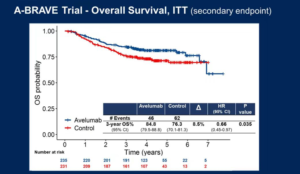 A-BRAVE研究目前的结果显示,在高危三阴性乳腺癌患者辅助治疗结束后,额外一年的阿维鲁单抗治疗并未显著改善患者的DFS,尽管有5.1%的数值差异,但在统计学上并未达到显著差异。然而,在次要研究终点上,该治疗在总生存期(OS)上显示出34%的死亡风险获益,这为我们提供了一丝希望。当然,该研究后续还将进行更深入的分析,以进一步探索PD-L1阳性表达水平与治疗效果之间的关系,但目前这部分数据尚未公布。